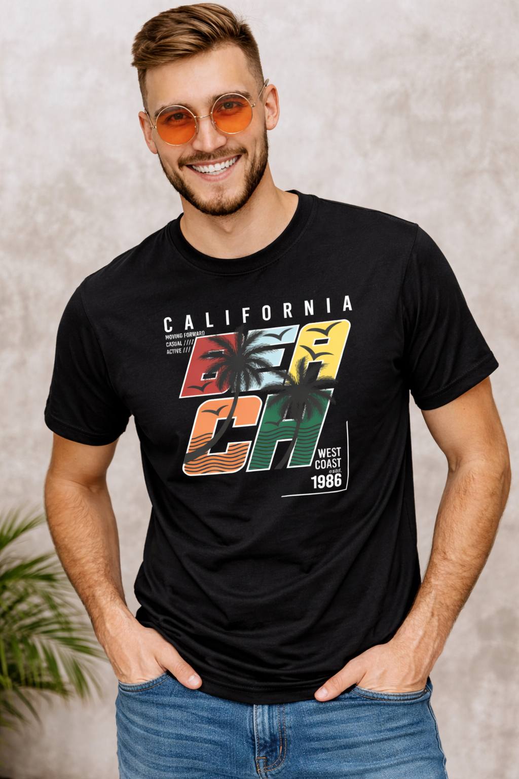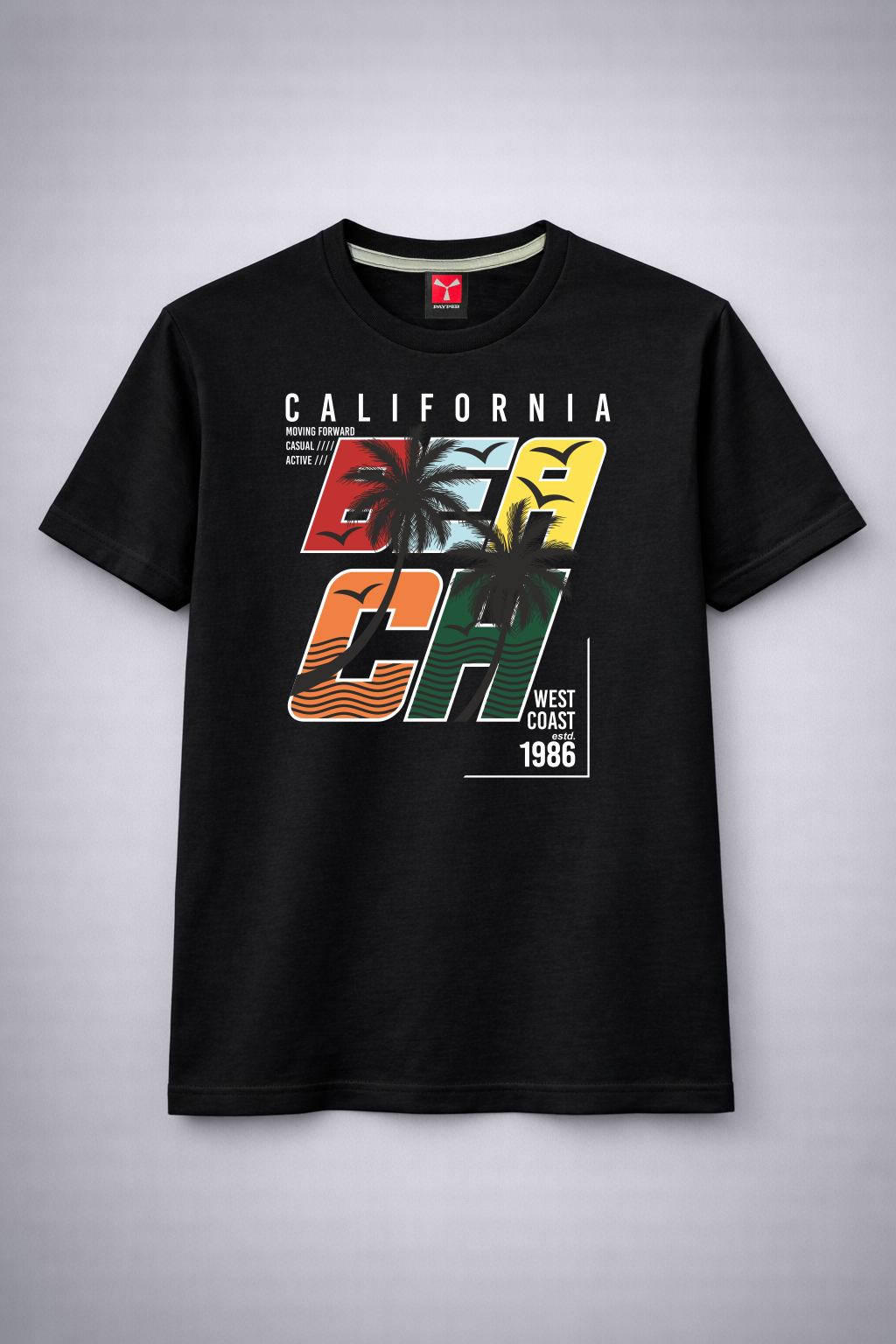Plonge dans l’esprit West Coast avec ce t-shirt noir au visuel California Beach 1986, inspiré des codes surf et lifestyle californien.
